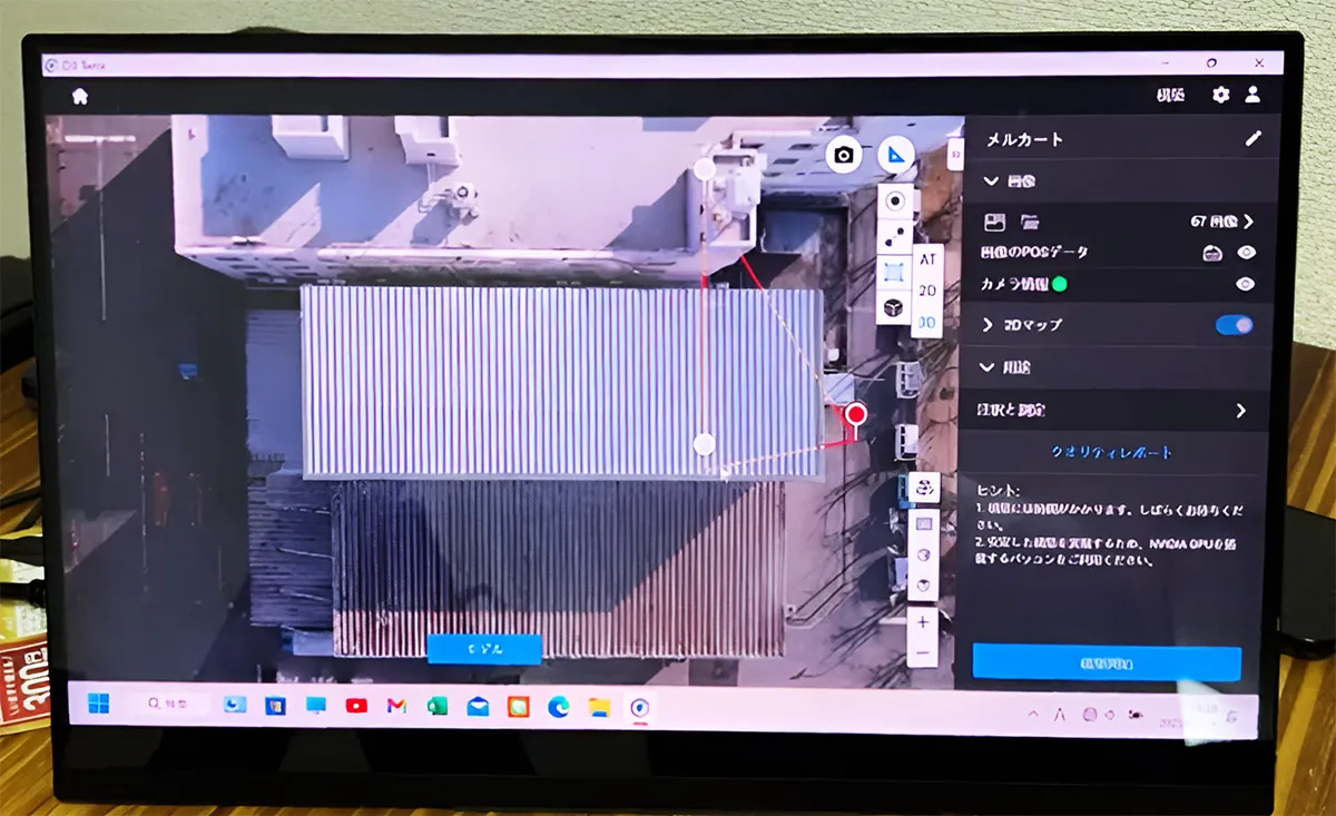 たとえば上空から建物をドローンで空撮した場合、その画像を専用のソフトで解析すると画像から1センチ単位で距離が測れます。